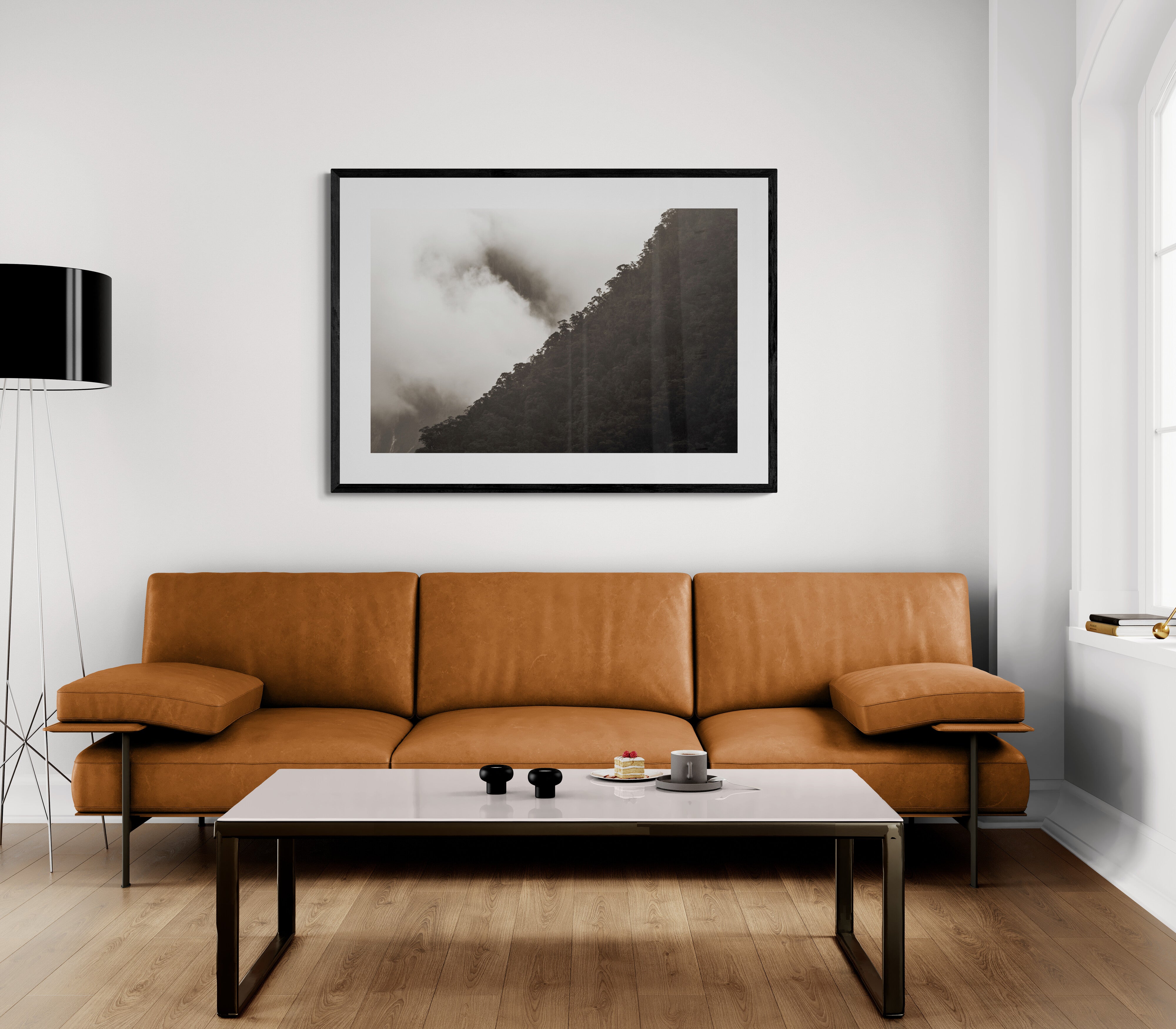 The mountain’s dense diagonal rising against drifting cloud.